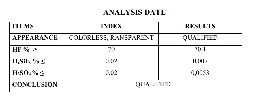 COMMODITY: HYDROFLUORIC ACID 70% MIN BATCH NO: 350700040021701
