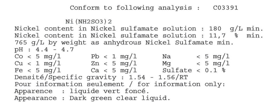 Nikel sülfamat, geleneksel yüzey işlemlerinde, elektronik endüstrisinde, havacılıkta, elektroformingde, hızlı “makaradan makaraya” tipi kaplamalarda kullanılır. Titanyum sepetlerde depolarize nikel anotların veya S nikel topaklarının kullanılmasını öneririz.